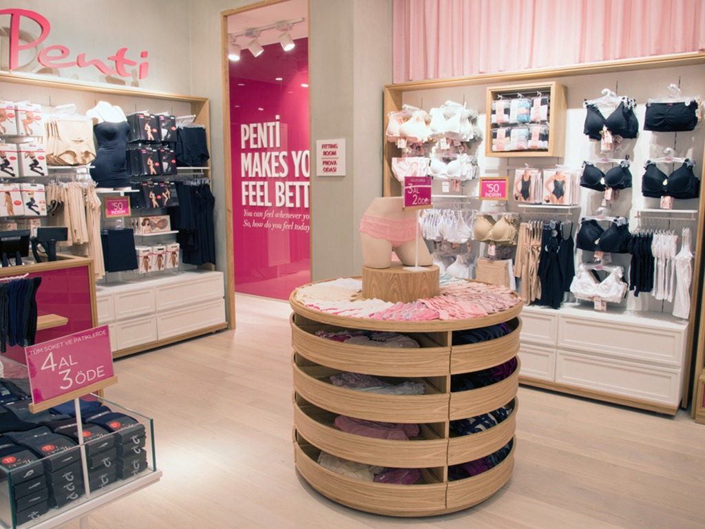 MKM METAL olarak sektörün önde gelen iç giyim markası PENTİ’nin mağaza içi görsel stantları, yatay sistemleri, dikey sistemleri, vitrin teşir ürünleri , orta stantlarını projelere uygun olarak tasarlayarak mağazalara teslim etmenin mutluluğunu yaşıyoruz.